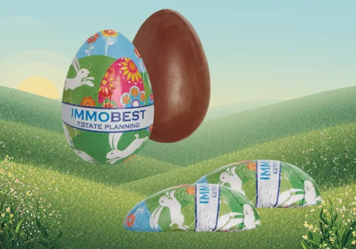 Każda czekoladka pakowana jest indywidualnie w aluminiową folię (biała, srebrna lub według dostępności), na której możemy wykonać pełnokolorowy nadruk logo, grafiki reklamowej lub życzeń wielkanocnych. Dzięki temu klasyczny świąteczny słodycz staje się skutecznym i eleganckim gadżetem reklamowym.